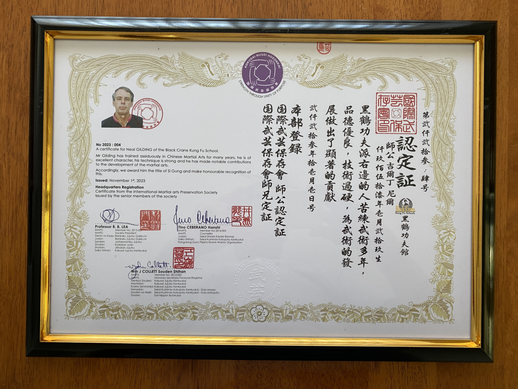 On 11th November, 2023, Si Gung Neil Gilding was recognised as the rank of Si Gung in front of 8 other martial arts master’s whom have a collective knowledge of close to 400 Years. The recognition was both to the International Martial Arts Preservation Society as well as Formal recognition of the rank of SiGung within the Black Crane Kung Fu Systems.